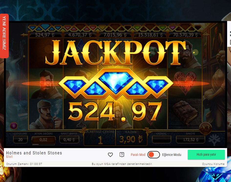 Holmes and Stolen stones oyununda kazandığım Mini Jackpot. Miktar çok yüksek olmasa da 40 kuruşluk bir bahis ile gayet güzel bir kazanç.