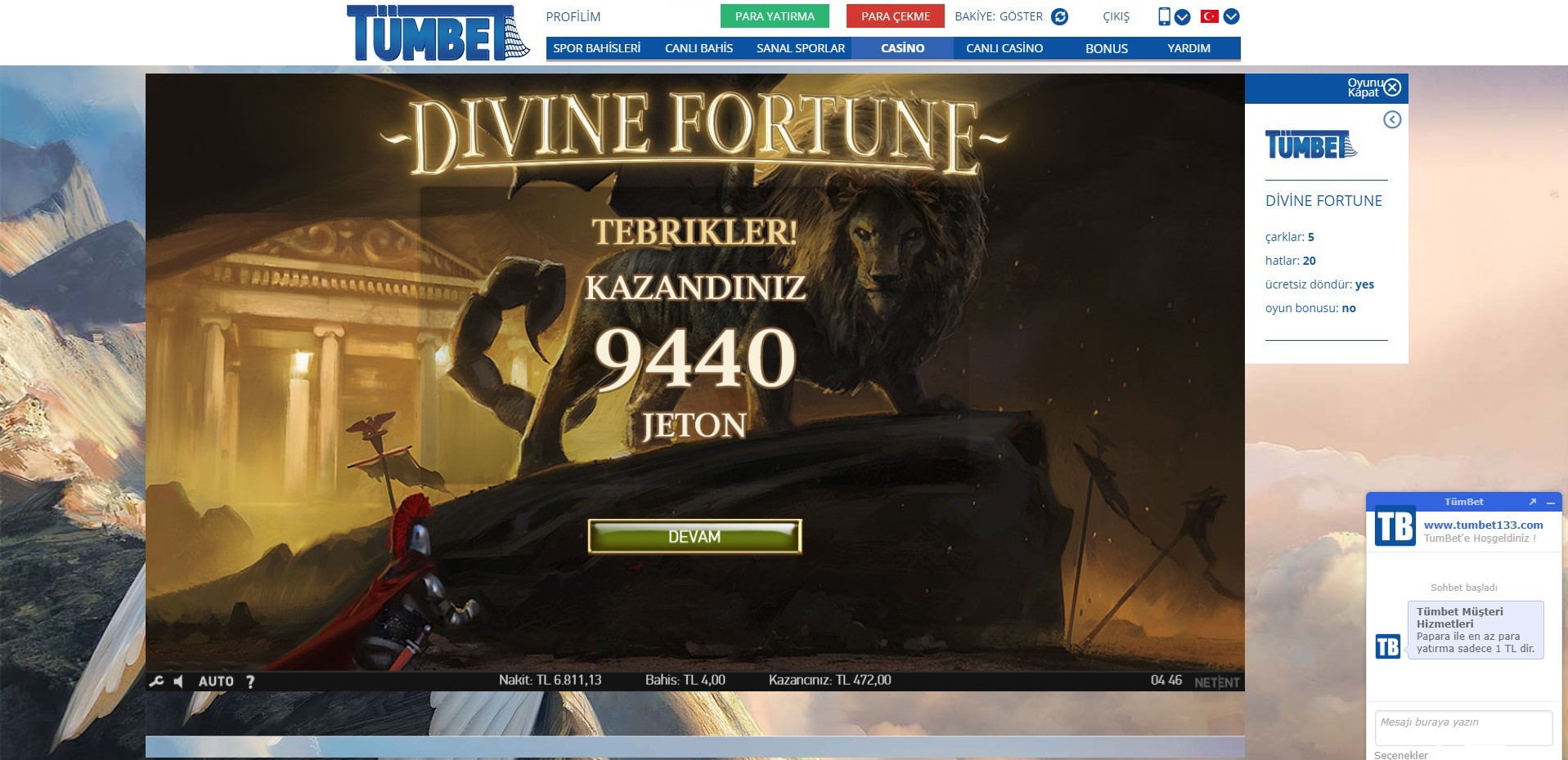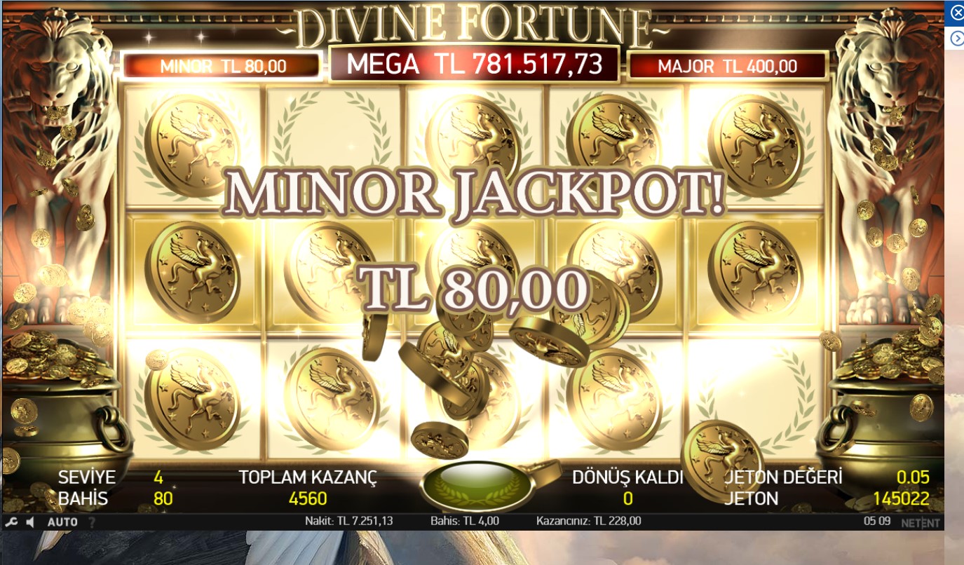 Uzun zamandır slot oyunlarına ara vermiştim , Netent’in  yüksek jackpot ödülü olan Divine Fortune oyununda tekrar başladım , bi kaç gündür oynuyorum papara ile para yatırıp 400 lira ile başladımdı 30-35 defa 80 TL olan minor jackpot’u 6-7 defa 400 TL olan major jackpot aldım hedefim mega jackpot olduğu için devam ediyorum kasam 7 bin küsürlerde şuanda  umarım mega jackpot ödülü olan 780 bin TL yi alınca da paylaşım yapabilirim sizlere..  Tümbet casino oyunları slot oyunları iyi ödüyor gerçekten tavsiye ederim..